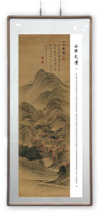 所藉清道光壬寅,即公元1842年潘思牧《仿古山水》四屏之三,立轴绢本,设色,纵136厘米,横42.5厘米,幅面约0.9平尺,题识:“八公秋霁。翠岩重叠白云中,楼阁参差竹木丛。随处停车依石径,晚来树树落霞红。壬寅春二月,潘思牧写。时年八十有七。”