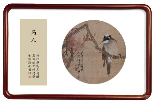 所藉清•任伯年《梅枝喜鹊图》扇面,绢本,设色,直径28厘米。