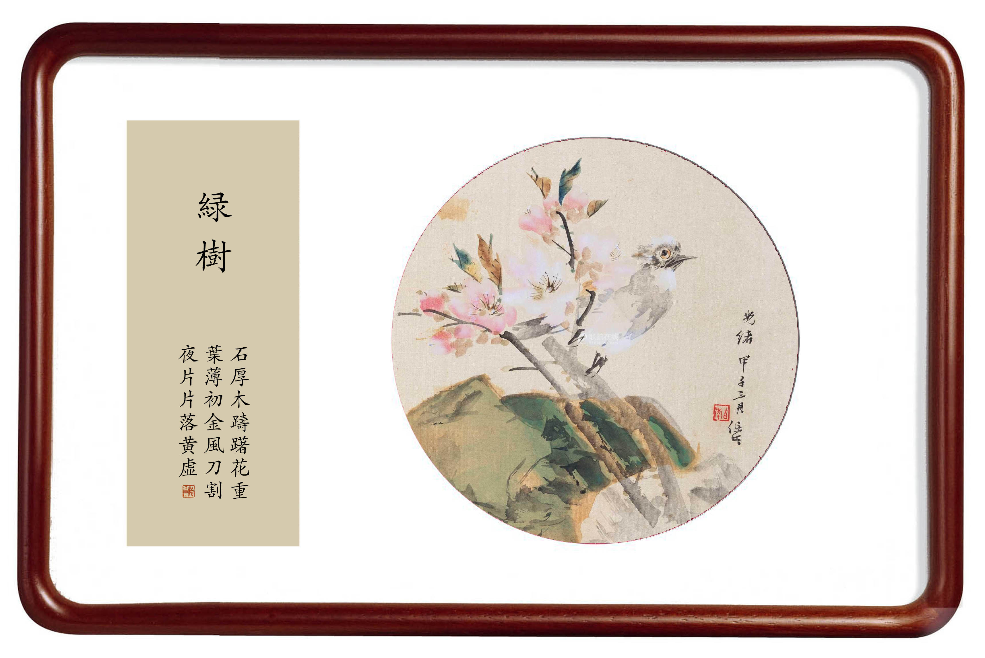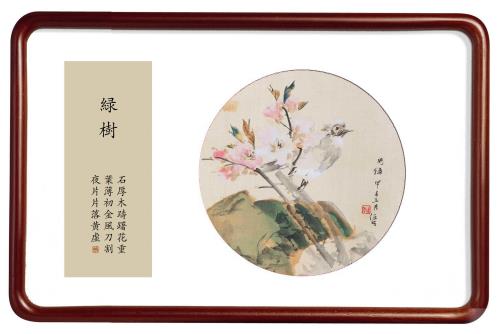所藉清•任伯年《桃花白头翁》扇面,绢本,设色,直径28厘米。