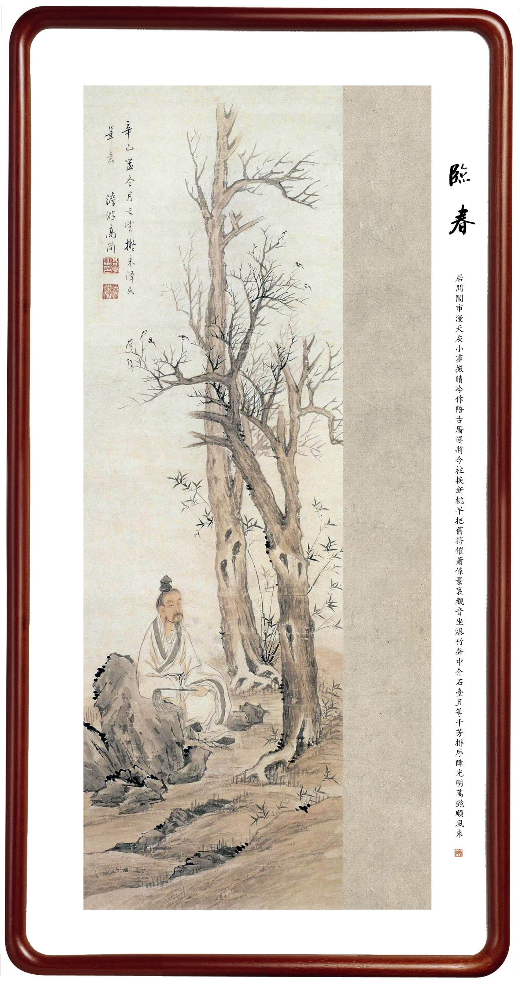 所藉清•高简《高仕图》,立轴,纸本,设色,纵91厘米,横30厘米,题识:“辛巳孟冬月之望,拟朱泽民笔意,澹游高简”。