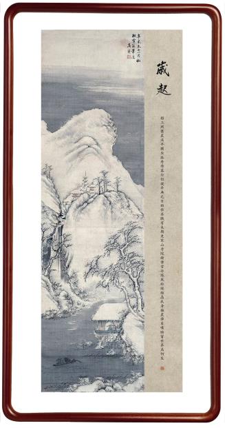 所藉清•康熙三十年,即公元1691年高简《寒江独钓》,立轴,绢本,设色,纵114厘米,横32厘米,题识:“辛未冬十一月仿松雪翁笔法”。