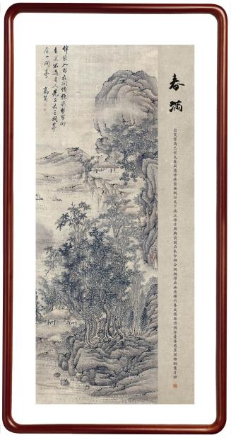 所藉清•高简《山水》,立轴,绢本,设色,纵105厘米,横46厘米,题识:“峰峦入眼最关情 便欲移家向杳冥 不道有人先占去 三间茅屋一间亭”。