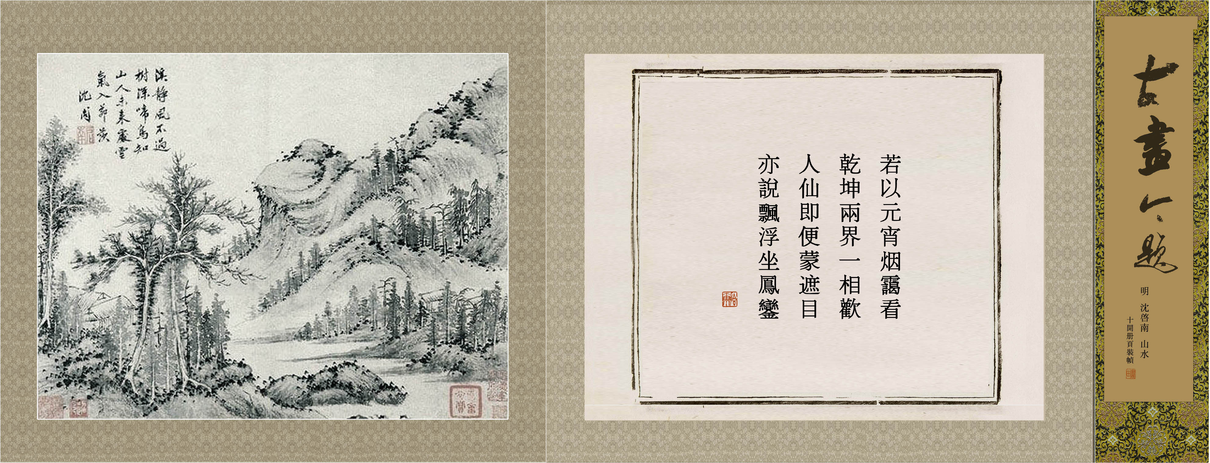 所藉明·沈周《山水》,十开册页之一,纸本,设色,题识:“溪静风不过,树深啼鸟知,山人未来处,云气入茆茨。”
