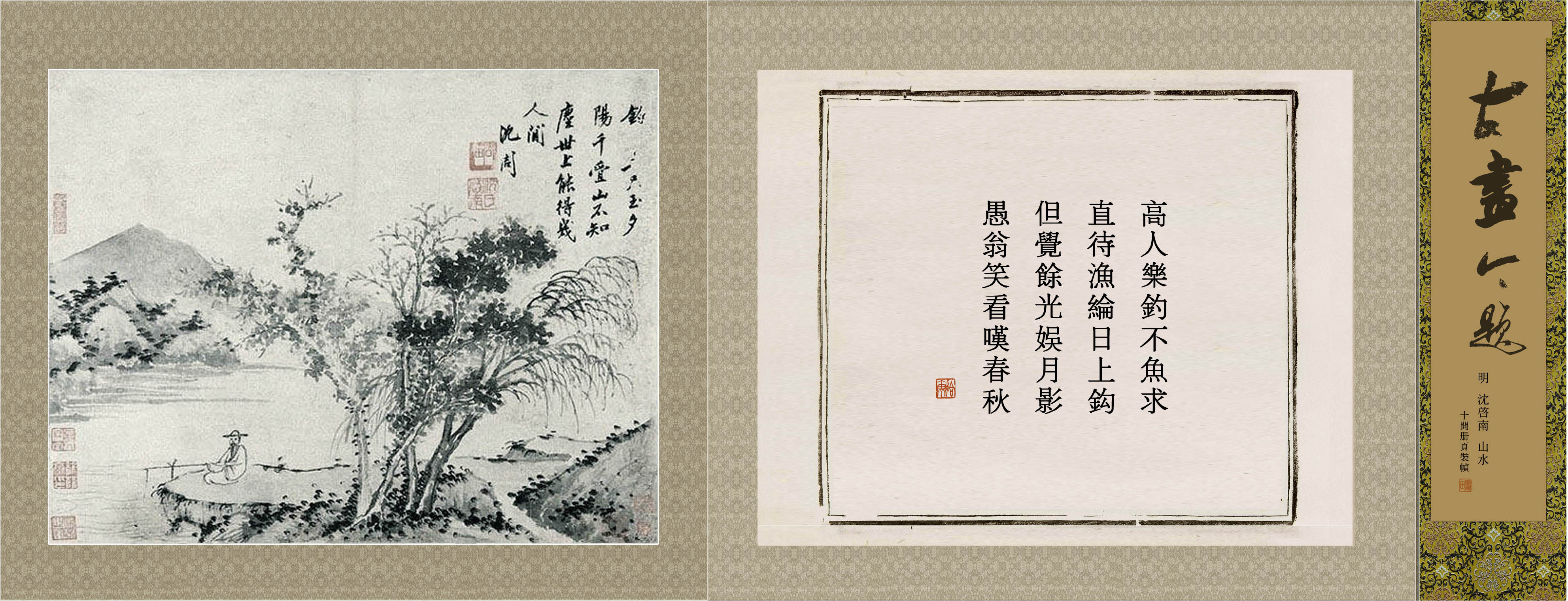 所藉明•沈周《山水》,十开册页之一,纸本,设色,题识:“钓□□只玉,夕阳千叠山。不知尘世上,能得几人间。”