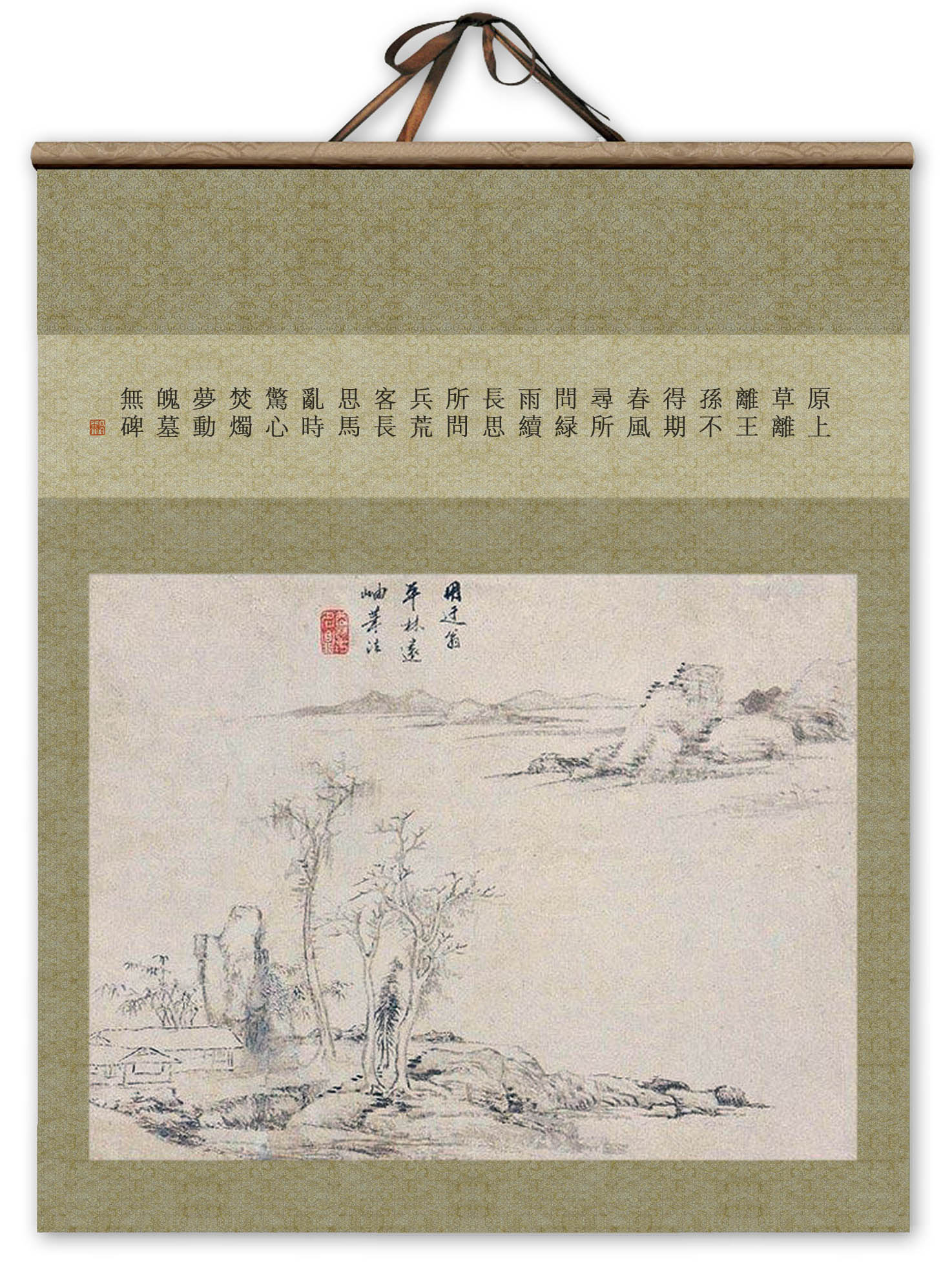 此乃电脑装裱之古画今题,标题取自宋•俞紫芝禅诗:“独坐清谈暂亦劳,碧松燃火热衾袍。夜深孺子唤不起,猛虎一声山月高”。然与原画原诗皆易趣也。