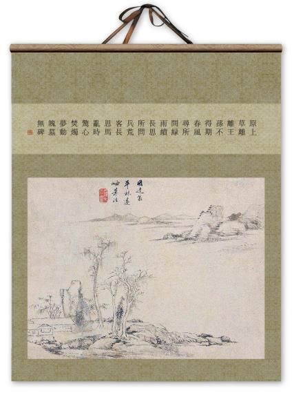 所藉清•黄尊《临古山水册》,册页八开,水墨,纸本,画心纵21厘米,横28厘米,题识:“用迂翁平林远岫笔法”。
