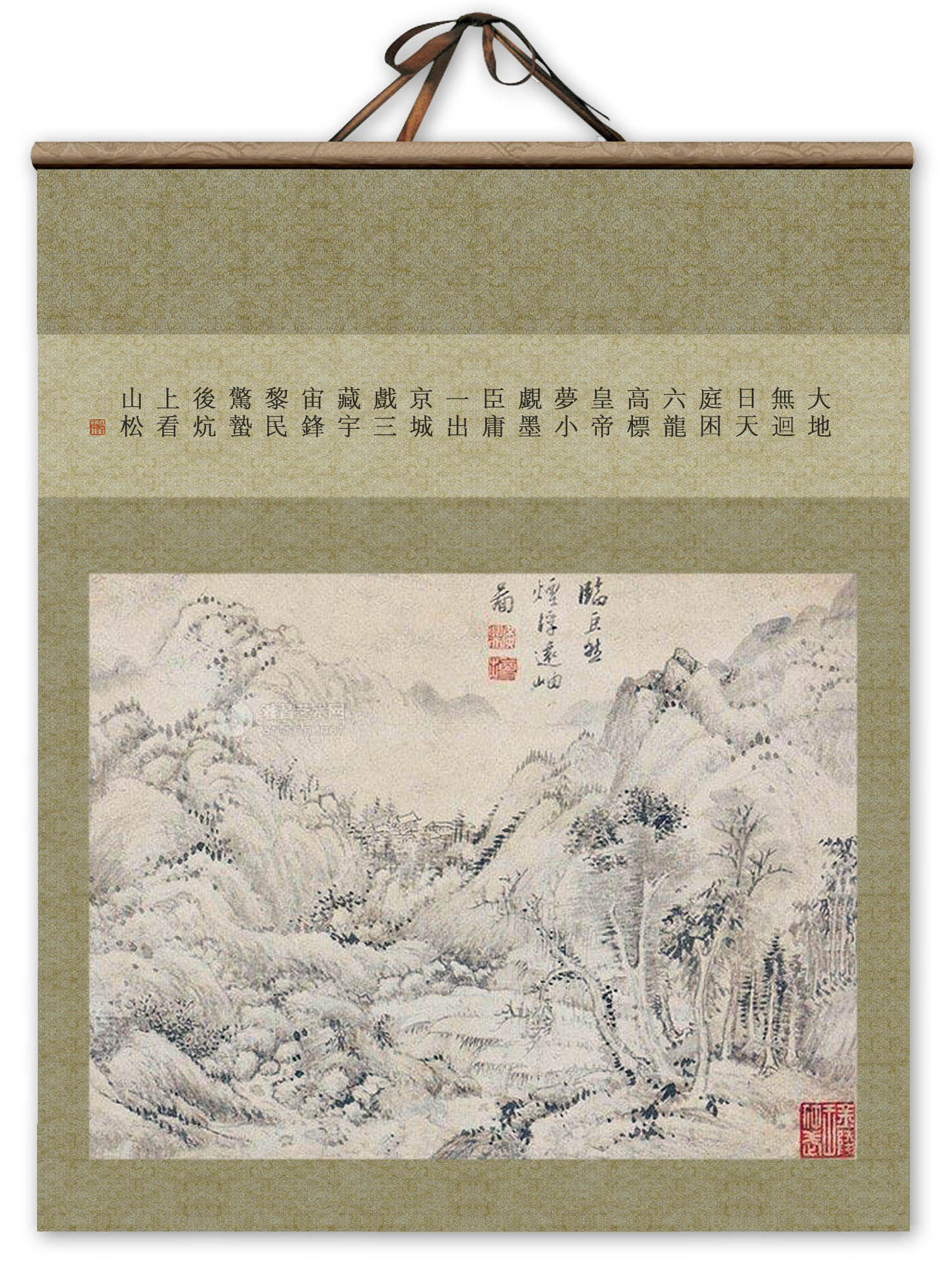 此乃电脑装裱之古画今题,标题取自宋•俞紫芝禅诗:“独坐清谈暂亦劳,碧松燃火热衾袍。夜深孺子唤不起,猛虎一声山月高”。然与原画原诗皆易趣也。