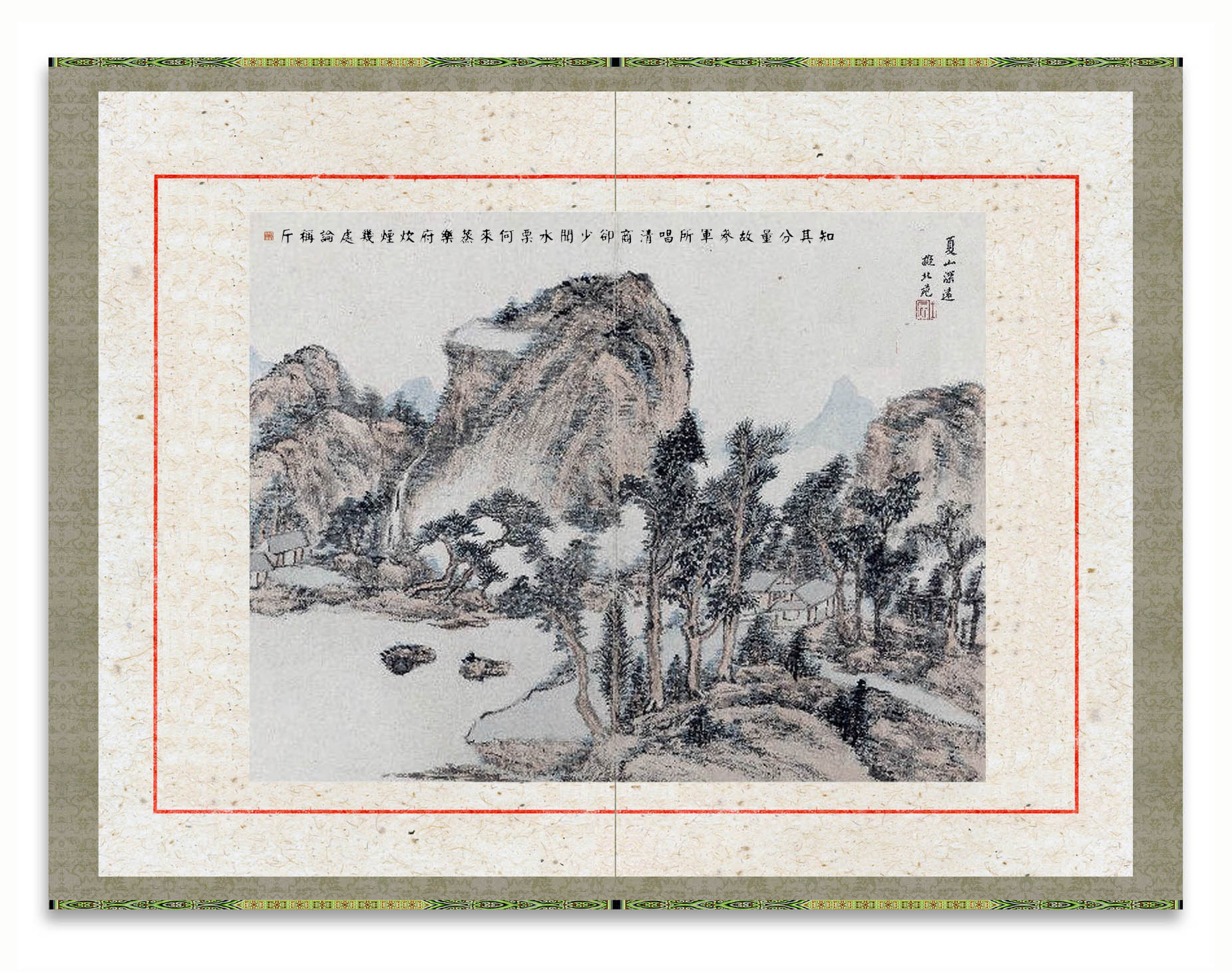 所藉清•王宸《拟古山水冊》,十二开册页之首,纸本,设色,画心纵38厘米,横48厘米,题识:“夏山深远”。