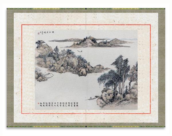 所藉清•王宸《拟古山水冊》,十二开册页之二,纸本,设色,画心纵38厘米,横48厘米,题识:“秋水渔矶”。