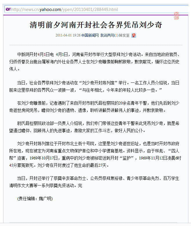 参观了两个小时,从博物院出来,无论我怎么回首,也没看出个“其外形呈覆斗,形似河南登封的观星台,据说内含‘九’数,意关‘九鼎定中原’”的名堂来。倒是见有卖报的,好象关于刘少奇的。回到住处在网络上查:是《清明前夕河南开封社会各界凭吊刘少奇》。
