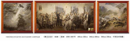 在此行京城的第四天, 5 月 10 日一整天都在中国国家博物馆里,我花了半个钟头,看了中央大厅专题《领袖 ·人民——馆藏现代经典美术作品展》,其中沈尧伊的一幅《遵义会议》(图 03 )已被当局收藏。其中还有一幅《井冈山会师》(图 04 ),林岗 1975 年的作品,也是文革中家喻户晓的。