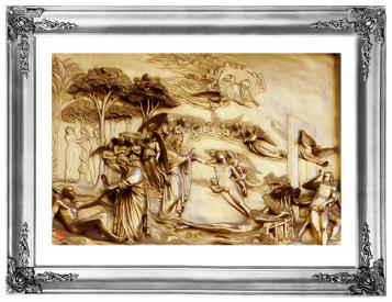 二、北侧的“曼多尔拉门”:1401年佛罗伦萨铜业协会举办了青铜门设计竞赛,由34位雕刻家、画家和金匠组成评审团裁判。规则是,所有的参赛者都必须仿效第一道门,即安德烈•比萨诺七十年前完成的南侧青铜门,提供相同的四叶草型的框架结构和尺寸,内容只限《圣经•旧约》中的基督生涯及其12门徒事迹。竞赛结果:寂寂无名而真有姓名的洛伦佐•吉贝尔蒂提交的28件设计图样胜出。时年他25岁。二十一后的1422完成。