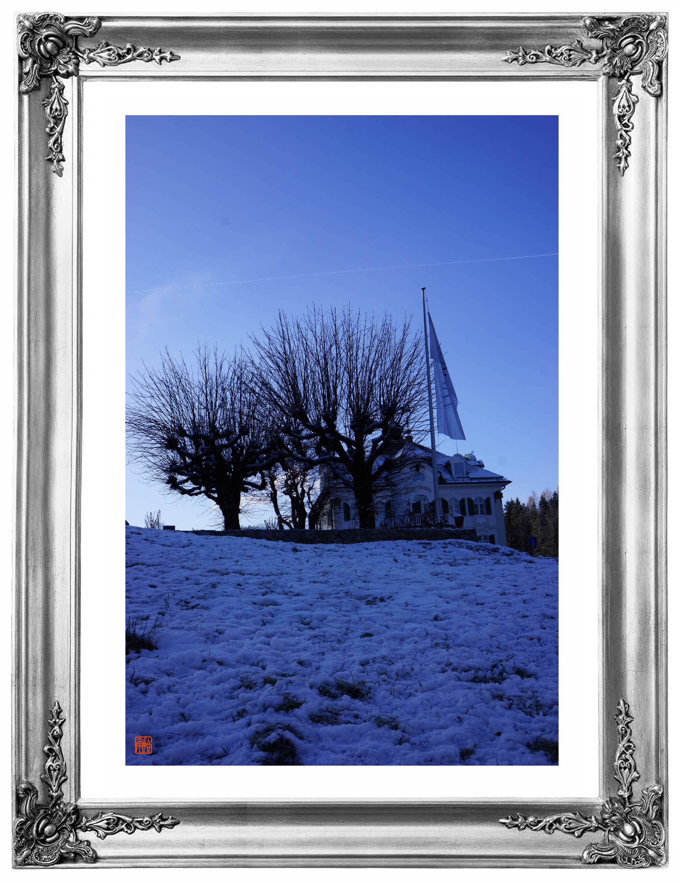 眺望或许是富森小镇,抑或还包括曾经受过近代工业化浪潮冲刷, 渐趋消失的原先自然乡村田园剩余的红色尖顶屋,阳光下的白墙面,及其美丽的湖泊,……